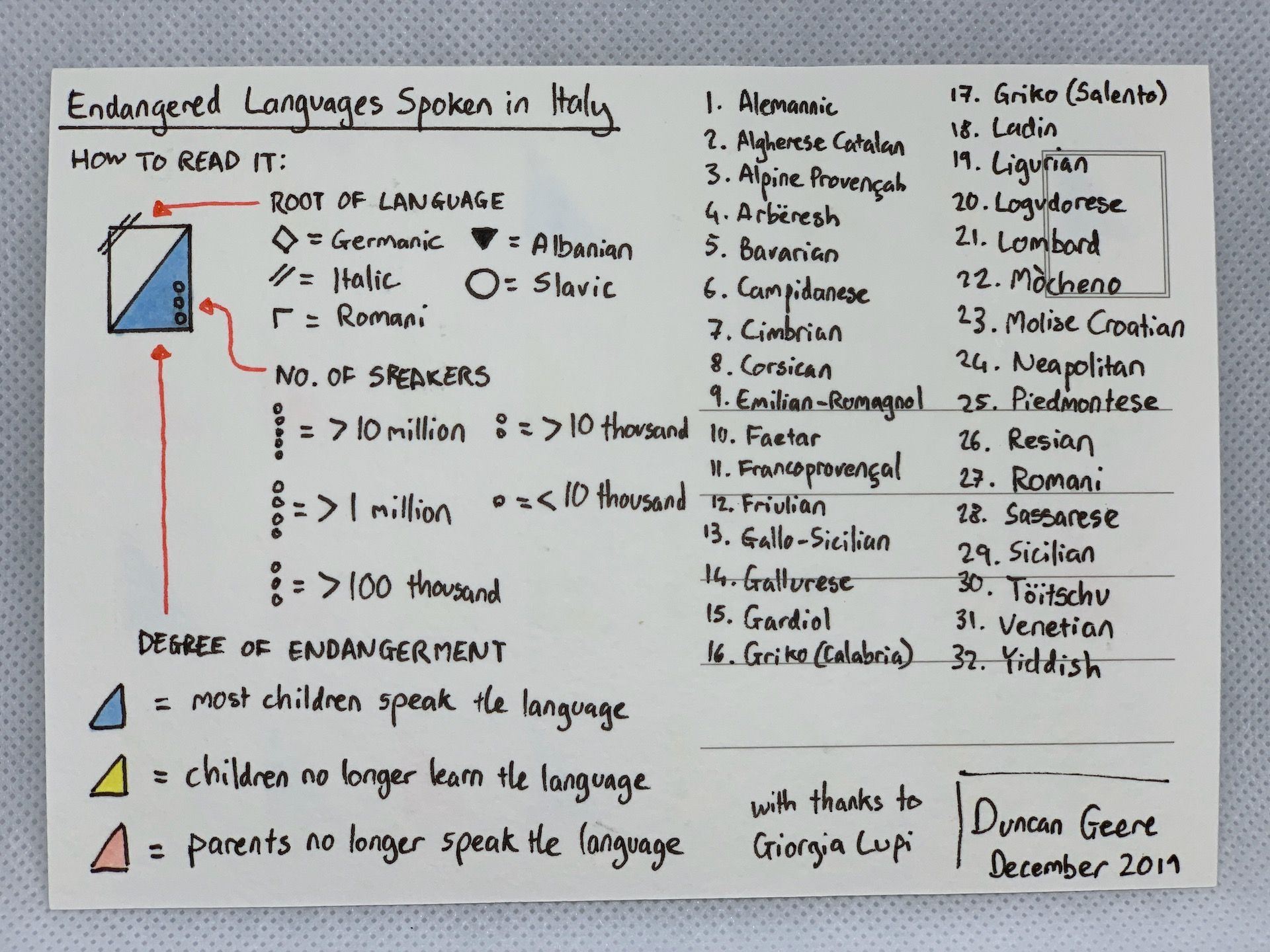 As a Christmas present for my stepfather, who is learning Italian, I drew a data visualisation showing the endagered languages spoken in Italy.
