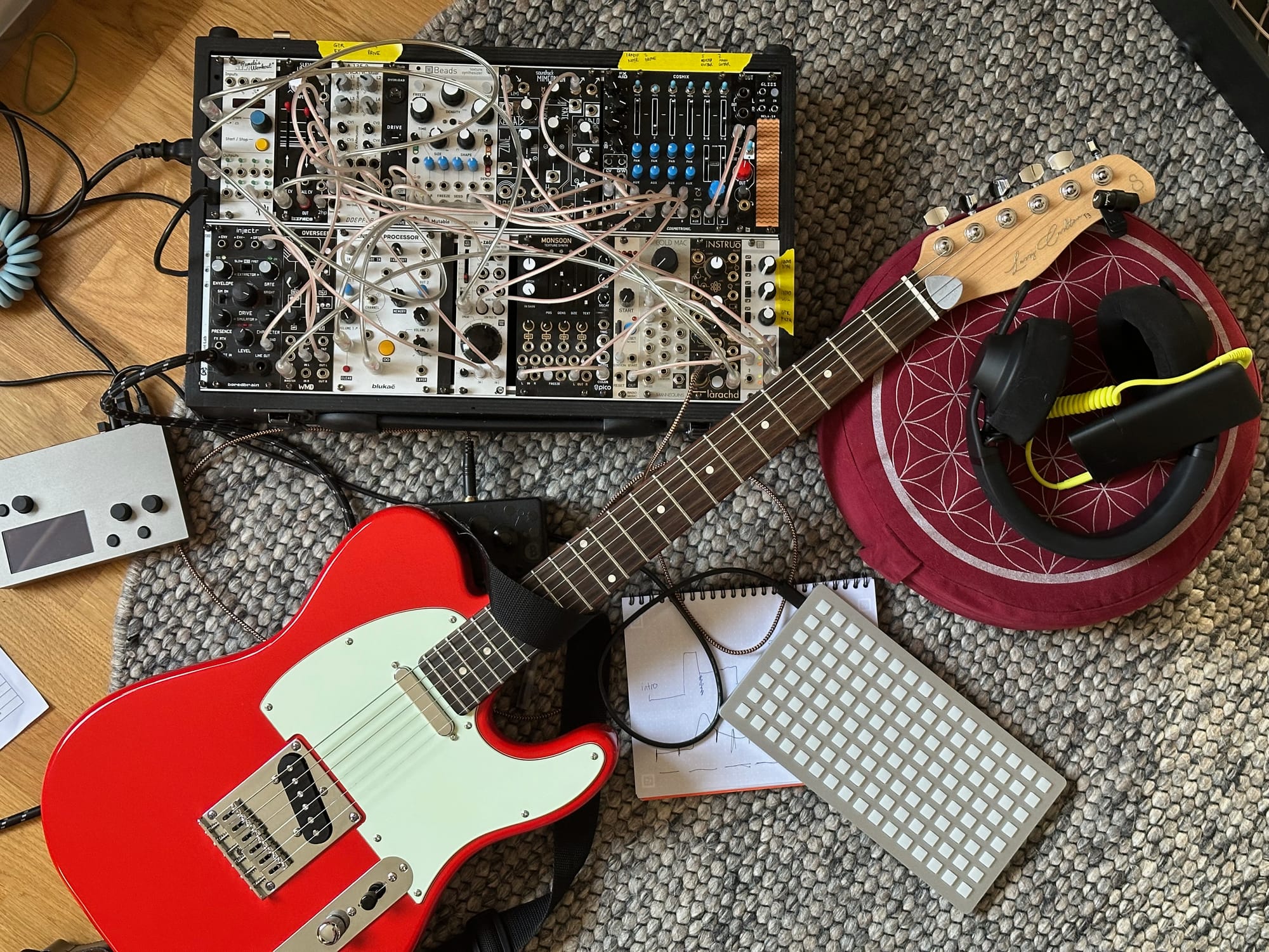 My performance is built around guitar, modular synths, and a custom script that I've written for the Norns music computer. The Norns script processes the data, sending signals that control the Eurorack. The guitar also goes into the Eurorack, where it's processed by an effects chain controlled by the data. Additionally, I'm using a collection of early recordings (including one from 1860, just a year after the Carrington Event), some more modern recordings of shortwave radio, and some white noise.