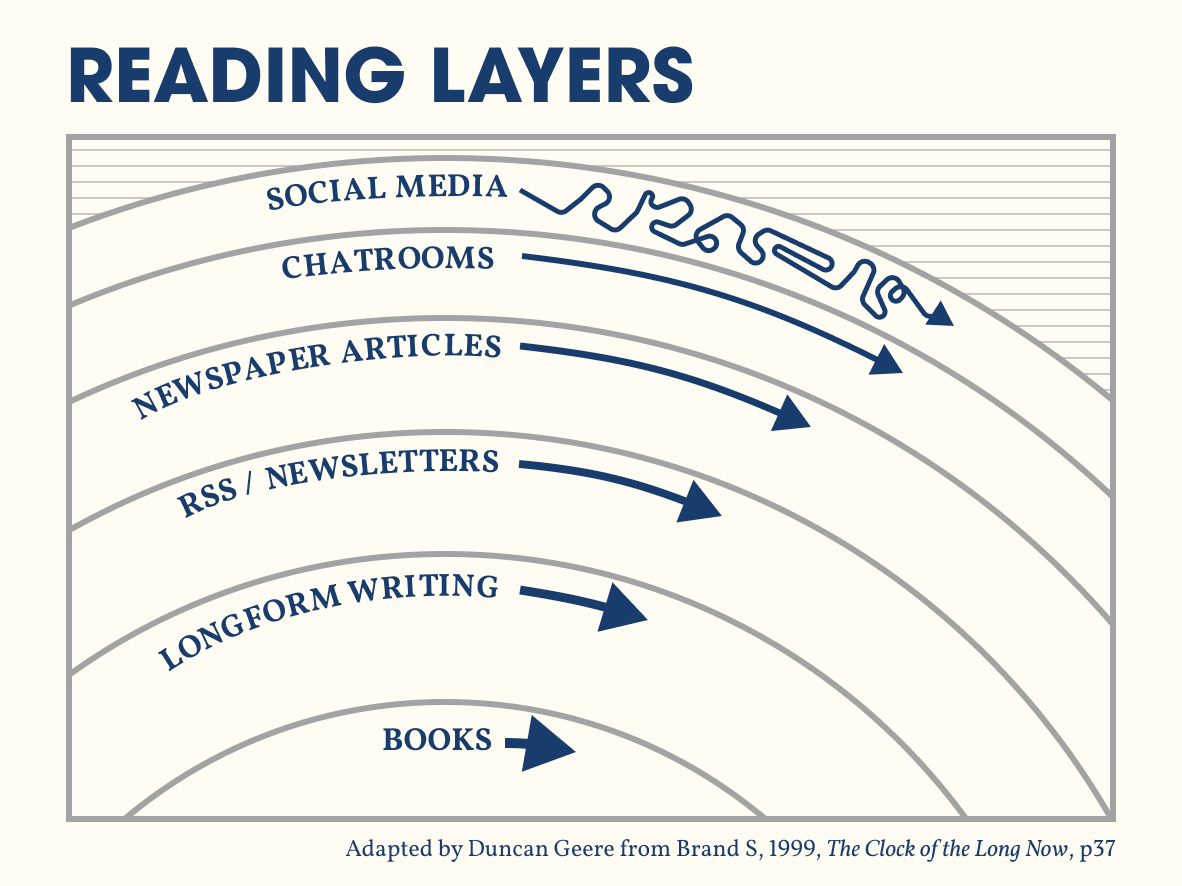 My reading layers, going from slowest to fastest would be: books, longform articles, RSS feeds & newsletters, newspaper articles, forums and chatrooms (Discord, Slack, etc), and then social media at the top.
