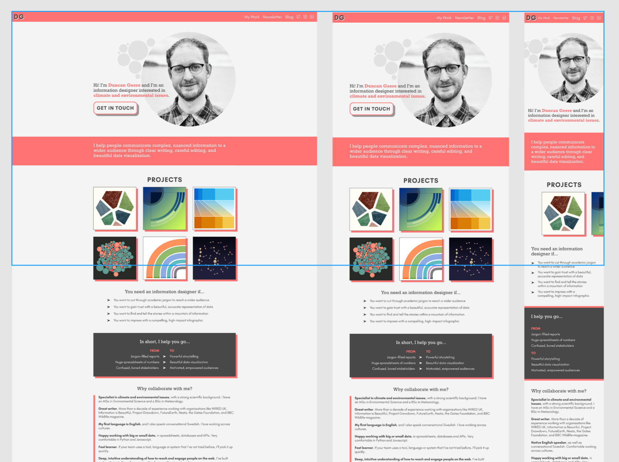 In January of this year I switched to doing more project-based work for clients, and realised slowly that I needed a site that actually sold my services, not just showcased my projects. It was time for a redesign. The first step was putting together a PDF portfolio, focused around the work I wanted to do - primarily on environmental topics. I finished this in April.