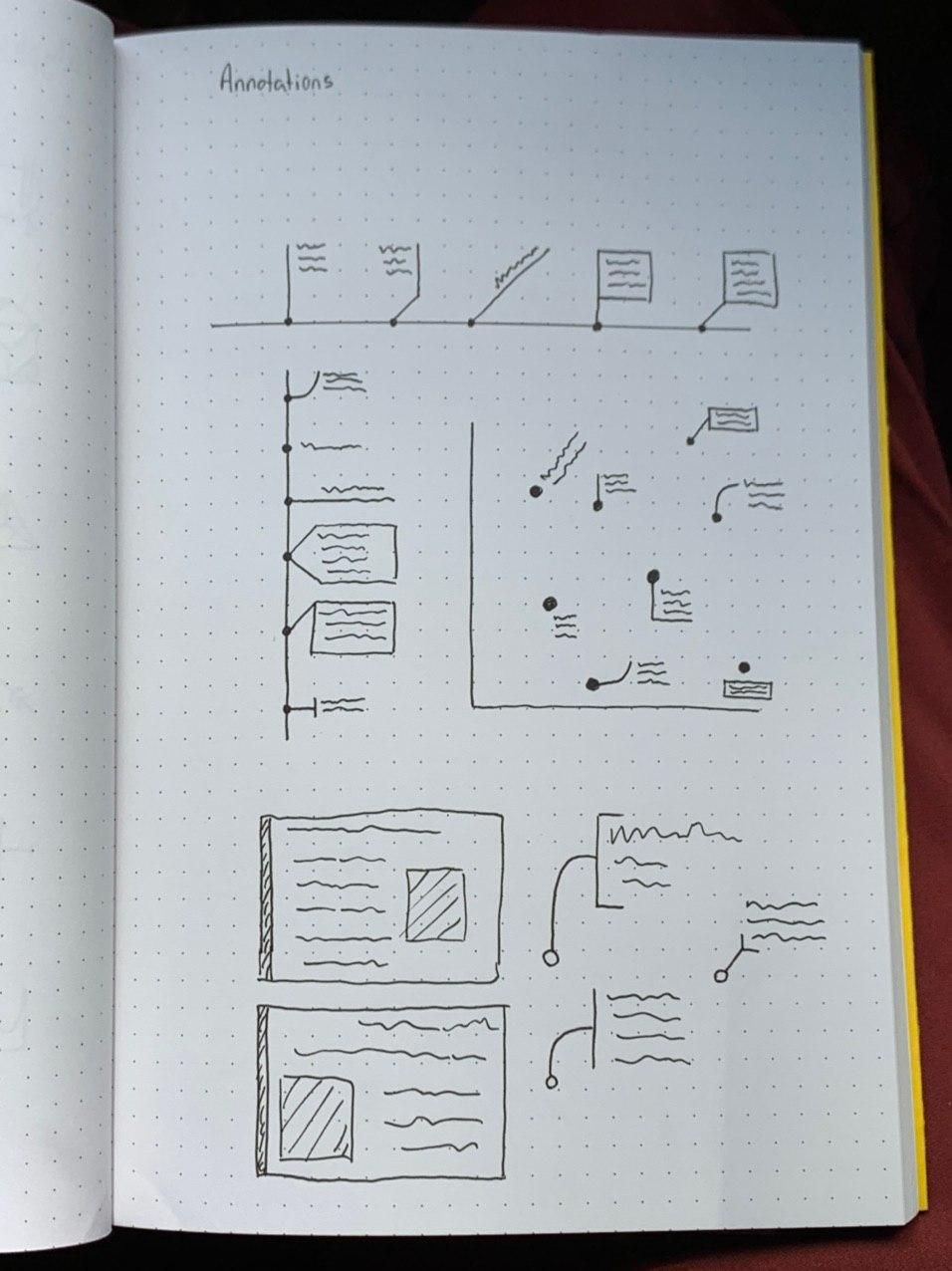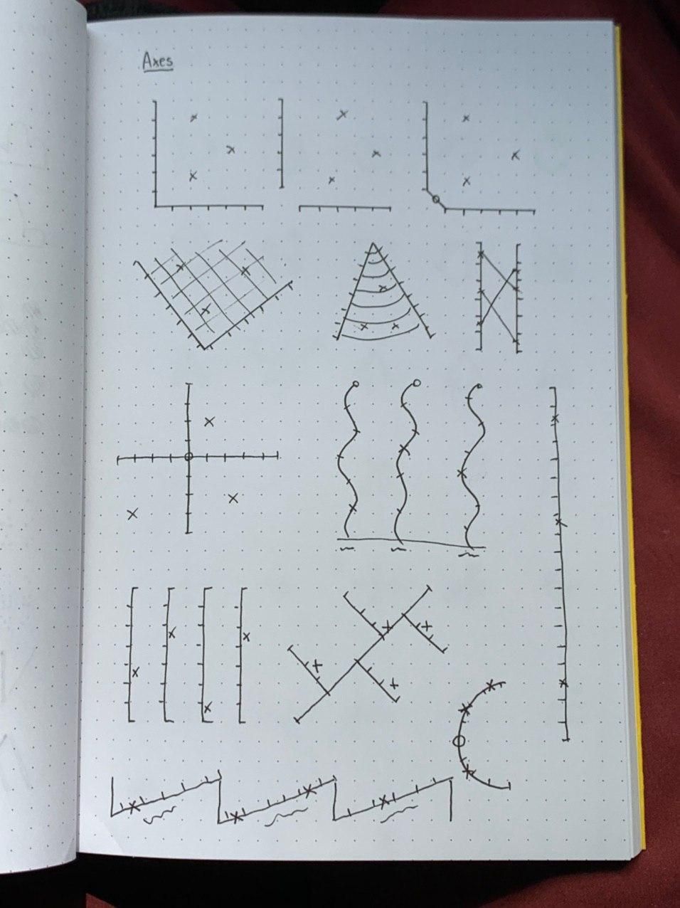 A monochrome collection, with two sets of glyphs. This is probably the influence of my generative art work appearing in my data sketches, but there are plenty of opportunities for encoding variables in this.