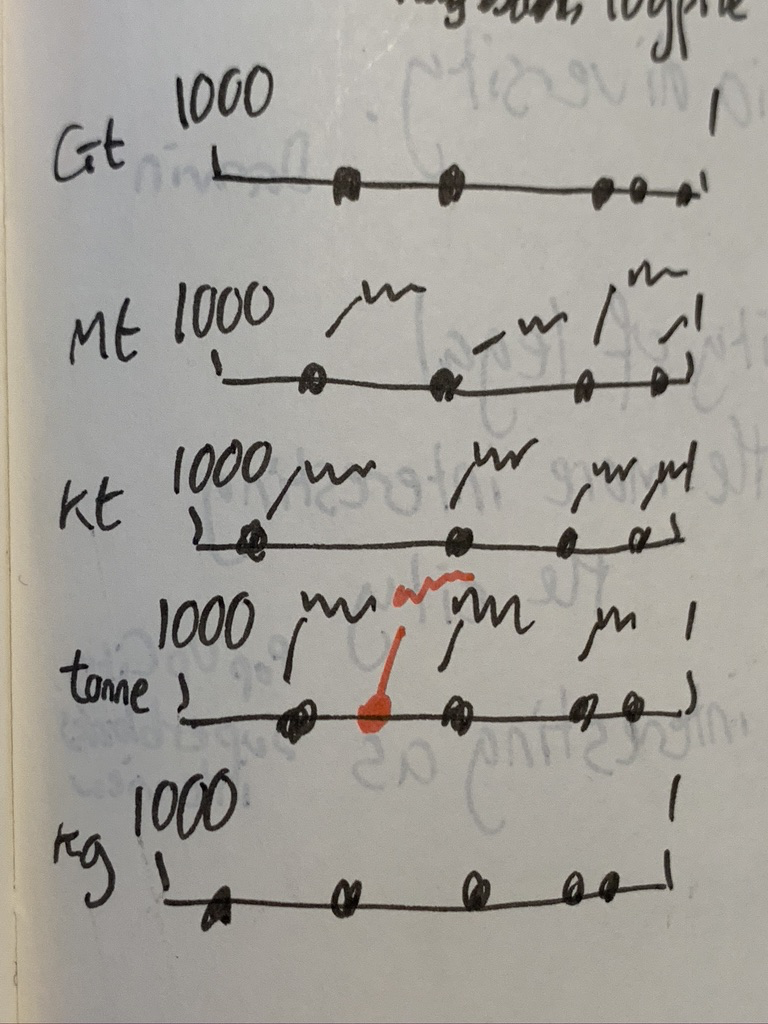 But what makes this graphic particularly special is that I think I've come up with a way of making log scales more accessible to average people, in what I'm calling a logpile chart. It's made up of a series of linear axes stacked on top of each other, each with a different scale (Gigatonnes, megatonnes, kilotonnes, tonnes, kg - for example), running from 1 to 1000. Rough sketch below. I'll need to test it out to see if it actually works in reality. But in my head it's a beautiful thing.