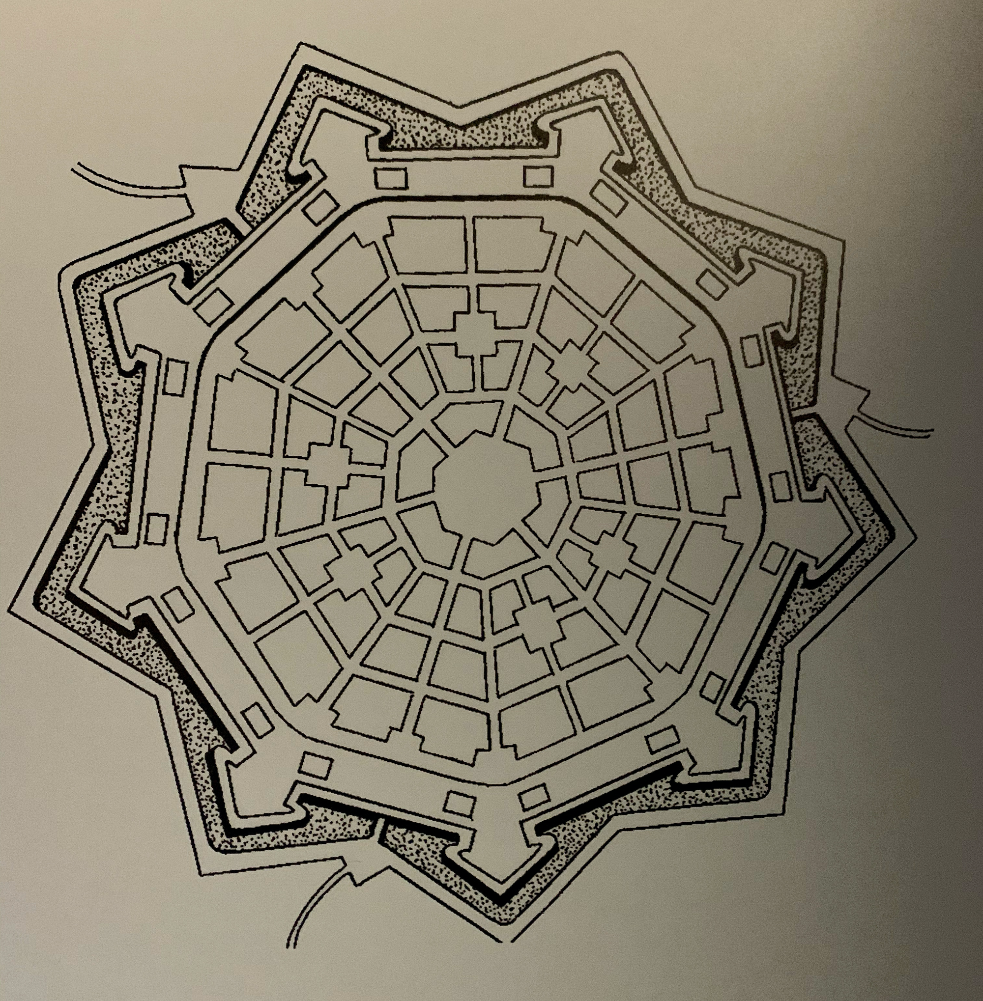 Alberti insisted on choosing the location of the town first, followed by careful setting up of the size and direction of streets, then location of bridges and gates, and finally a building pattern ruled by perfect symmetry.