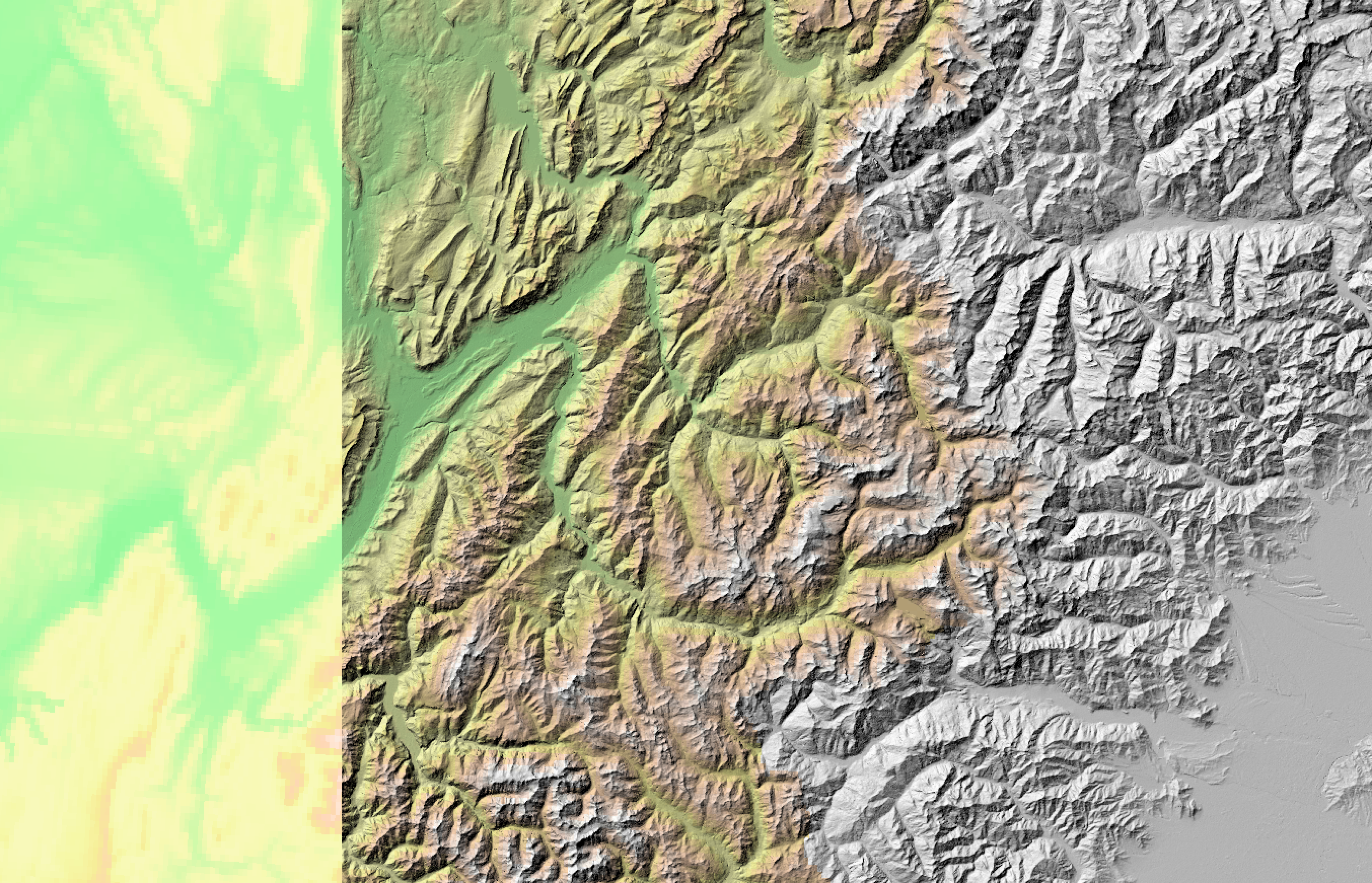The biggest issue I had was the difficulty of finding good elevation data at a high-enough resolution for what I wanted to do. Everything started looking pixelated when I zoomed in. I'll keep digging, but in the meantime here's an hour or so's work: