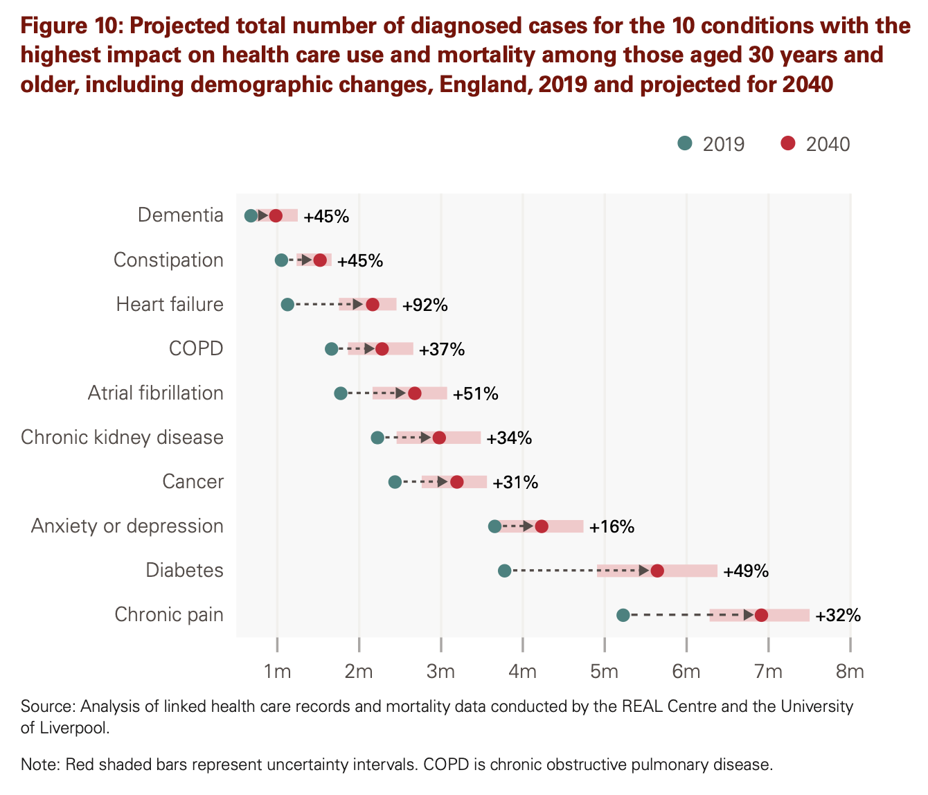 - 9.1 million people in England are projected to be living with major illness by 2040, 2.5 million more than in 2019. This is an increase from almost 1 in 6 to nearly 1 in 5 of the adult population.