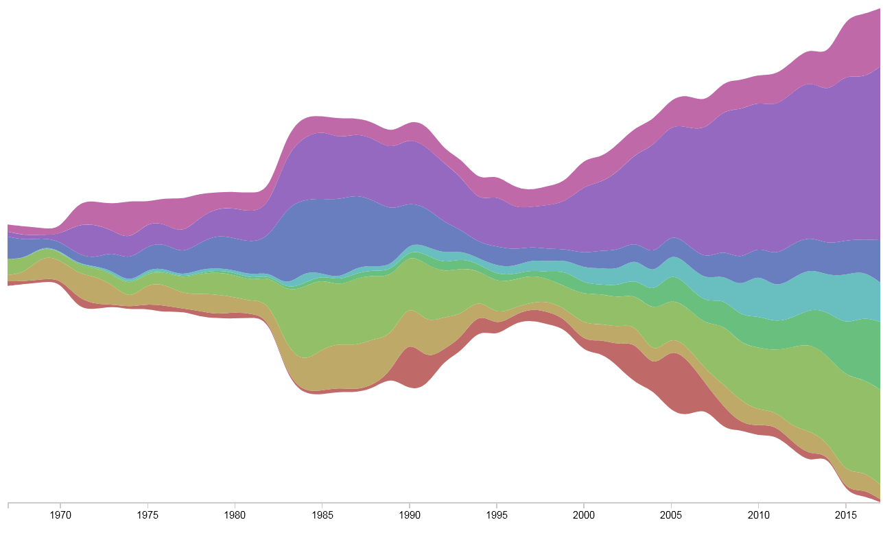First I made a quick streamgraph in Rawgraphs. This is the data from Beautiful News' "Foreign Aid Has Exploded" graphic. It originally comes from OECD. The colours are different categories of aid.