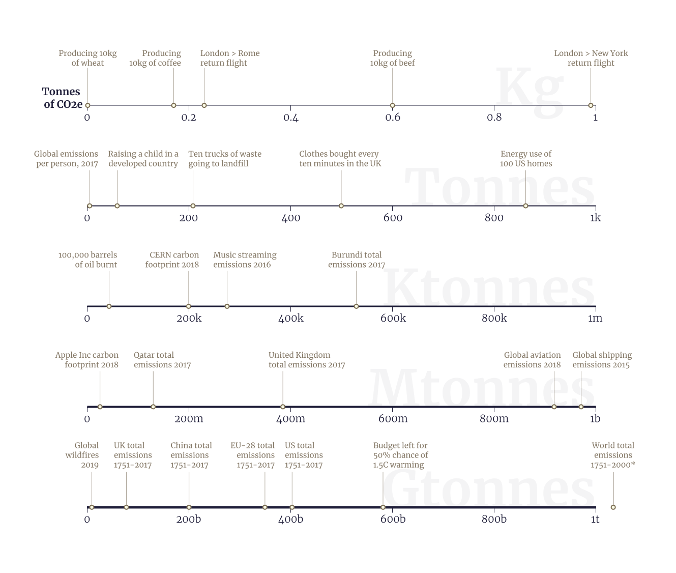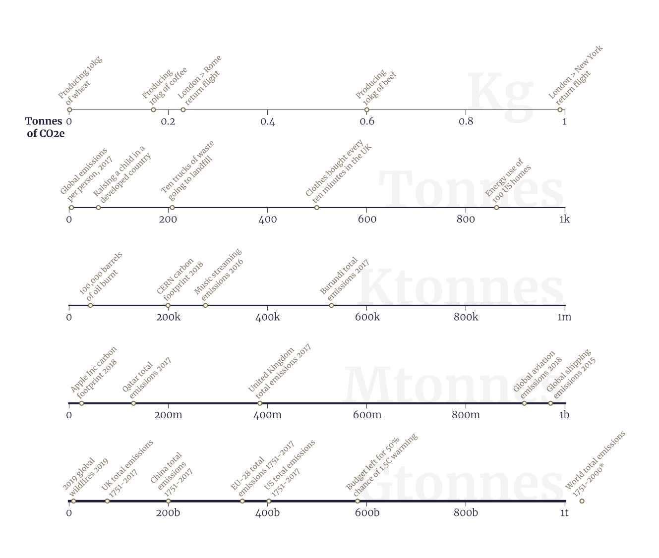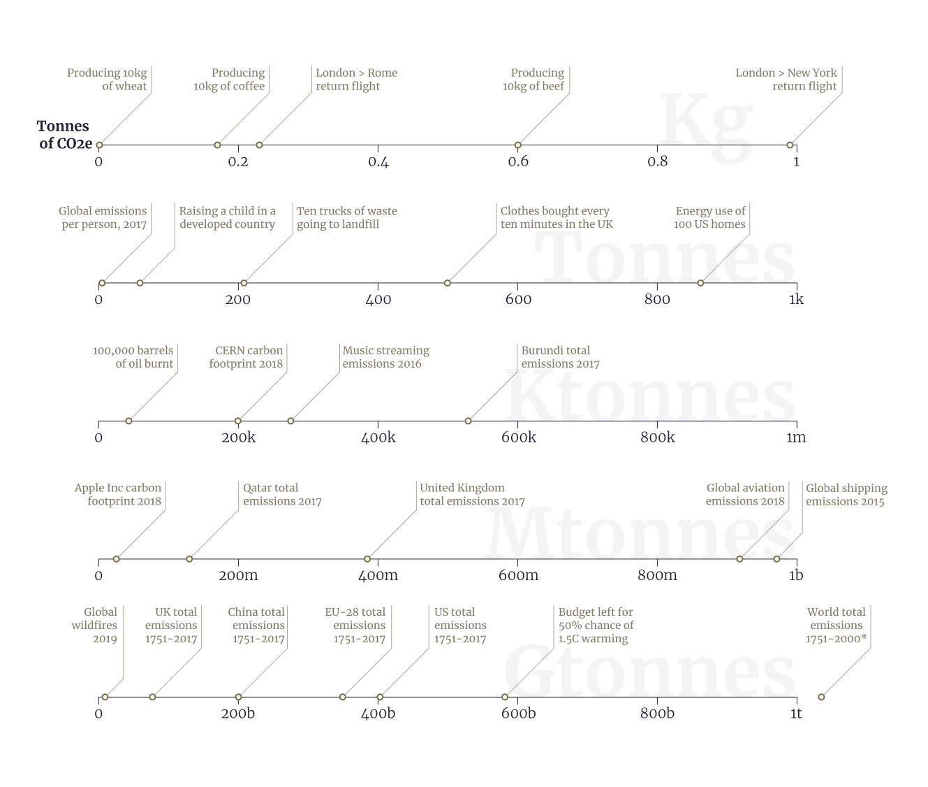 I think this chart works very well for its core purpose β which is to allow for the comparison of widely-varying quantities, and for a reader to quickly get context for a number they've found somewhere else. As well as carbon emissions, I think this would work nicely for dollar amounts, distances, weights or spans of time, among others.