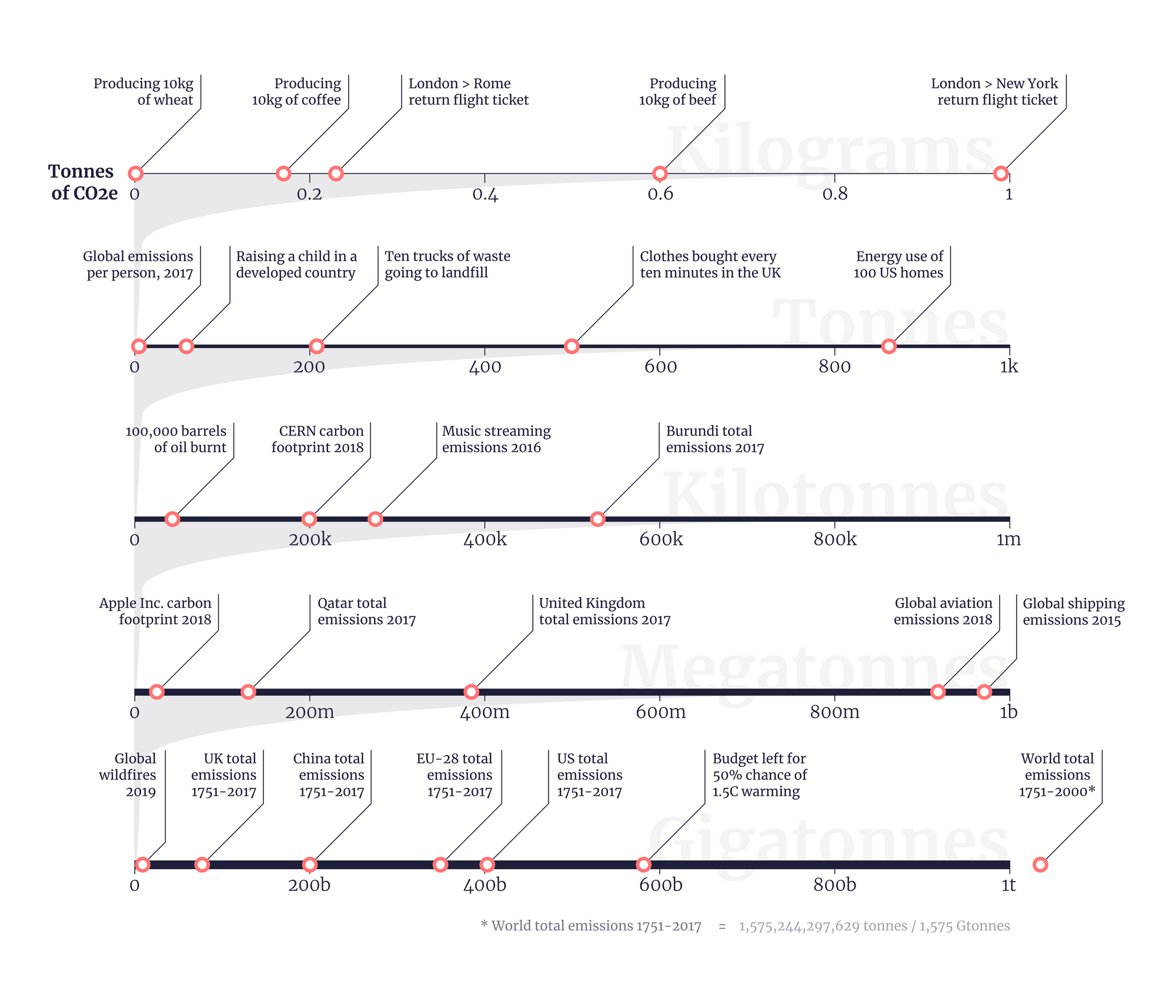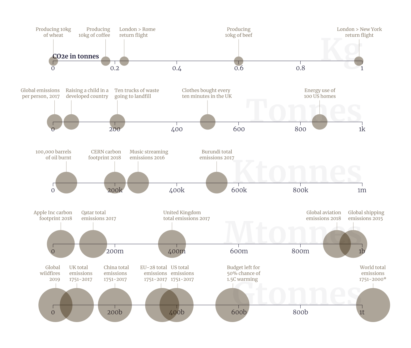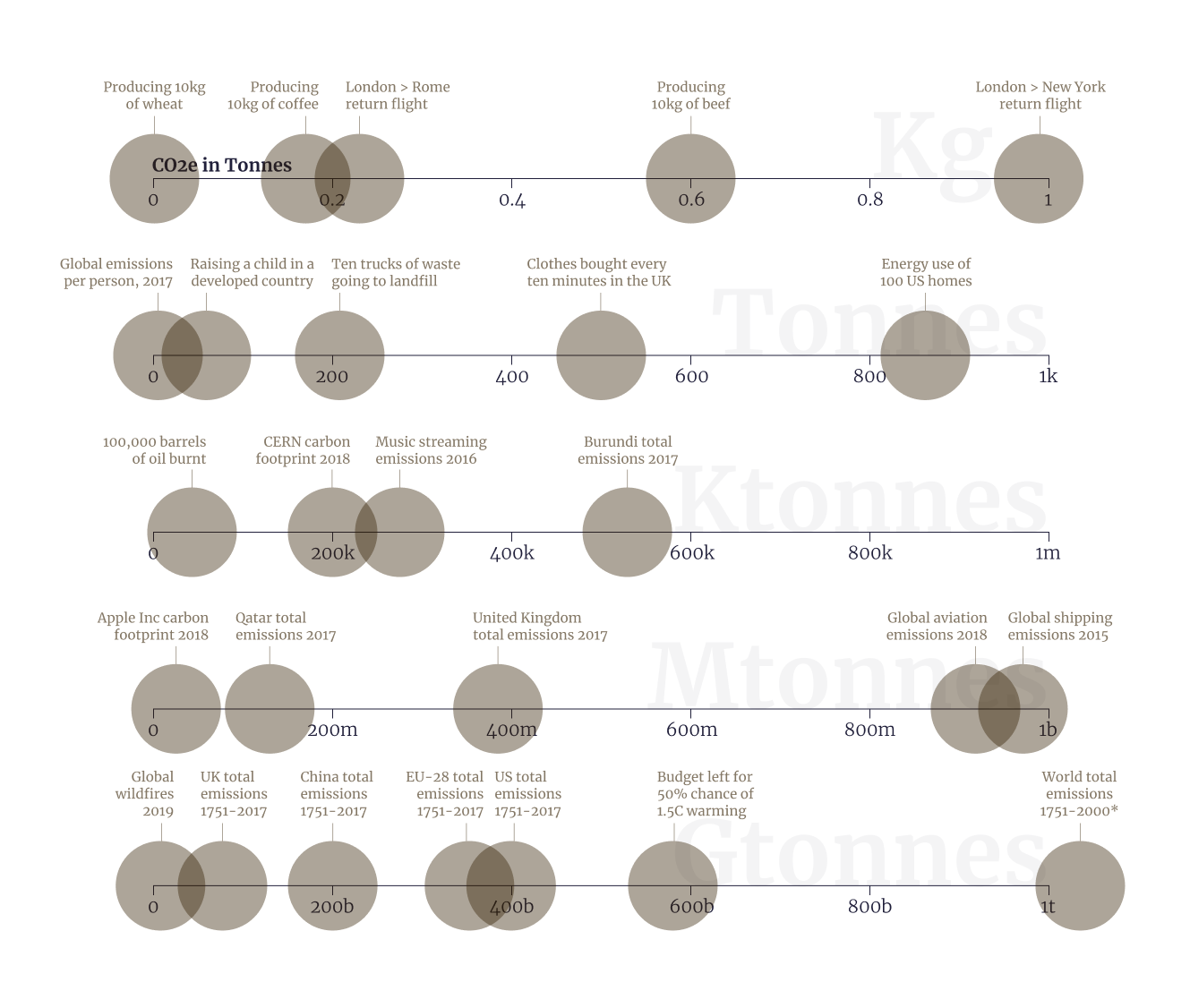 As I'm publishing this idea during Earth Week, I decided to illustrate the concept with different carbon emissions figures β which I've found people have a very loose handle on. How much CO2 is emitted by producing wheat versus beef burgers, or by taking a transatlantic flight, or by different countries each year, or by the global shipping industry?